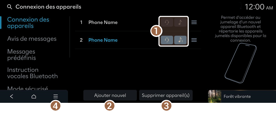 Garez le véhicule dans un endroit sûr avant de connecter un appareil Bluetooth au système. En effet, si le conducteur n'est pas attentif à la route, il peut provoquer un accident de la circulation et engendrer des dommages, blesser des personnes et/ou entraîner la mort de personnes.