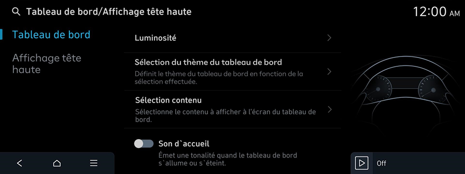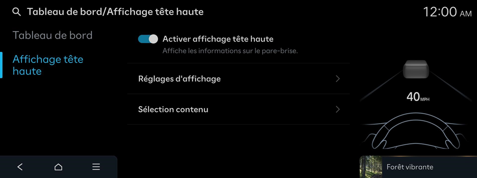 - Sur l'écran d'accueil, appuyez sur Configuration ▶ Tableau de bord/Affichage tête haute.
