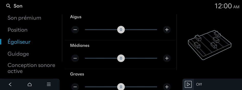 Réglez le son en ajustant le niveau (de sortie) de chaque bande audio : graves, Moyens et Aigus.
