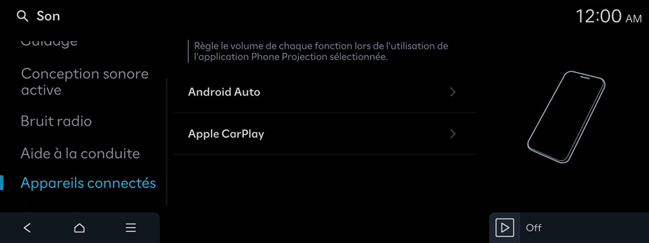 Règle le volume de chaque fonction lors de l'utilisation de l'application Phone Projection sélectionnée.