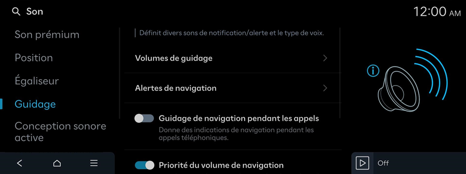 Le volume média sera réduit pendant le guidage de navigation. Cela peut ne pas s'appliquer aux médias fournis par les applications de projection de téléphone.
