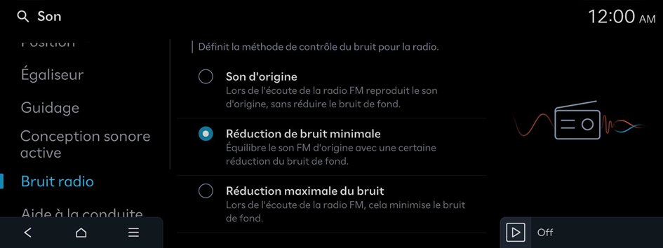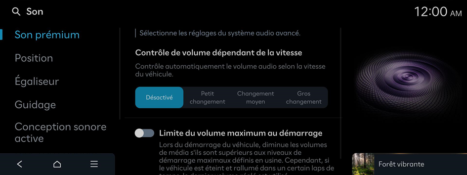 Lors du démarrage du véhicule, diminue les volumes de média s'ils sont supérieurs aux niveaux de démarrage maximaux définis en usine. Cependant, si le véhicule est éteint et rallumé dans un certain laps de temps, le dernier volume réglé est utilisé.