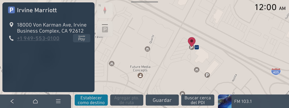 - Seleccione una cochera/estacionamiento cercano asociado a Hyundai Pay en la pantalla del mapa, y presione Hyundai Pay para acceder a la pantalla de pago.
