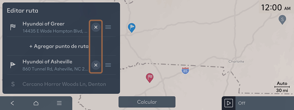 al lado del destino para eliminarlo. - Para volver a buscar la ruta después de eliminar el punto de ruta, presione Calcular.