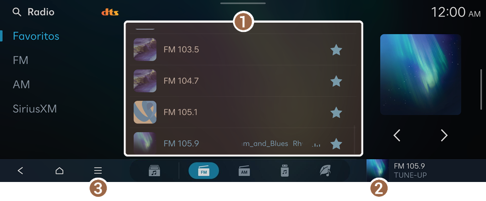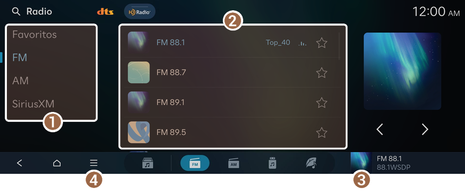 - Muestra una lista de estaciones guardadas en Favoritos.