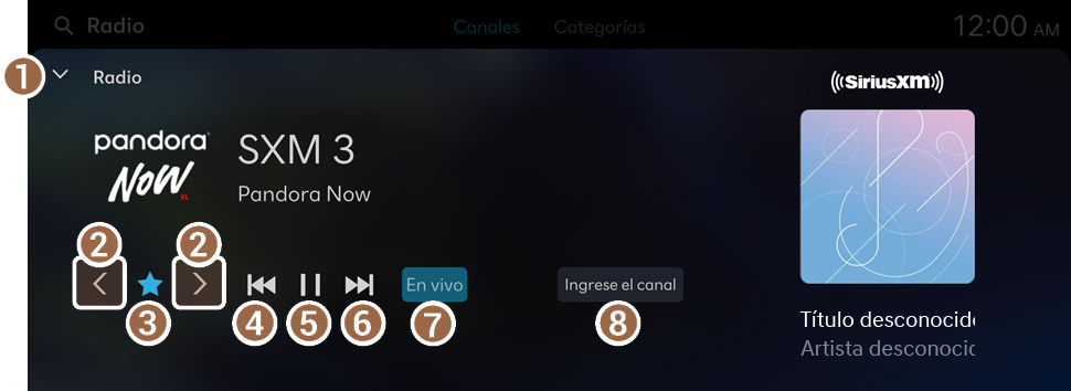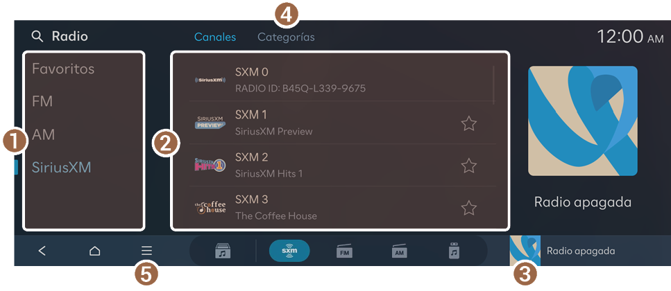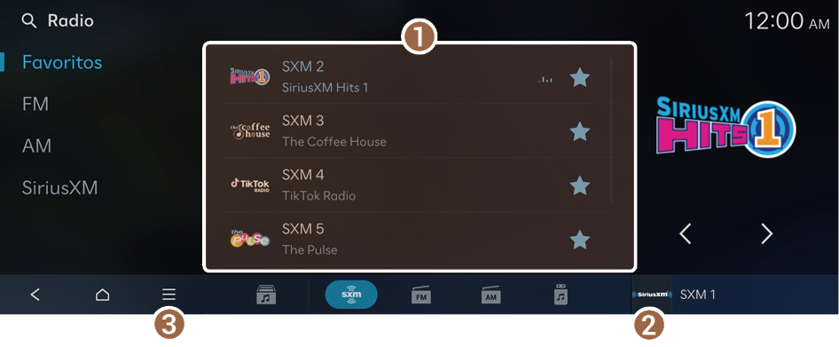 Busque y escuche estaciones de radio SiriusXM. Guarde sus estaciones preferidas en la lista de favoritos.