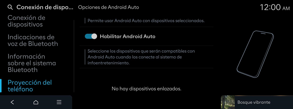 - En la pantalla de inicio, presione Configuración ▶ Conexiones del dispositivo ▶ Proyección del teléfono ▶ Opciones de Android Auto y luego habilite Habilitar Android Auto.