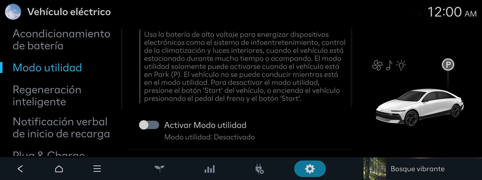 Usa la batería de alto voltaje para energizar dispositivos electrónicos, como el sistema de infoentretenimiento, la climatización y las luces interiores, cuando el vehículo está estacionado durante mucho tiempo o acampando.