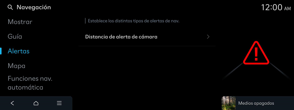 - • Distancia de alerta de cám. según límite de vel.: Establece automáticamente la hora en que recibirá alertas sobre las cámaras de control de tráfico en función de la velocidad del vehículo. Cuando la función de Distancia de alerta de cám. según límite de vel. está desactivada, se puede seleccionar el momento en que se puede obtener la guía para las cámaras de control de tráfico en Distancia de alerta de cámara (calles locales) y Distancia de alerta de cámara (Autopistas).
