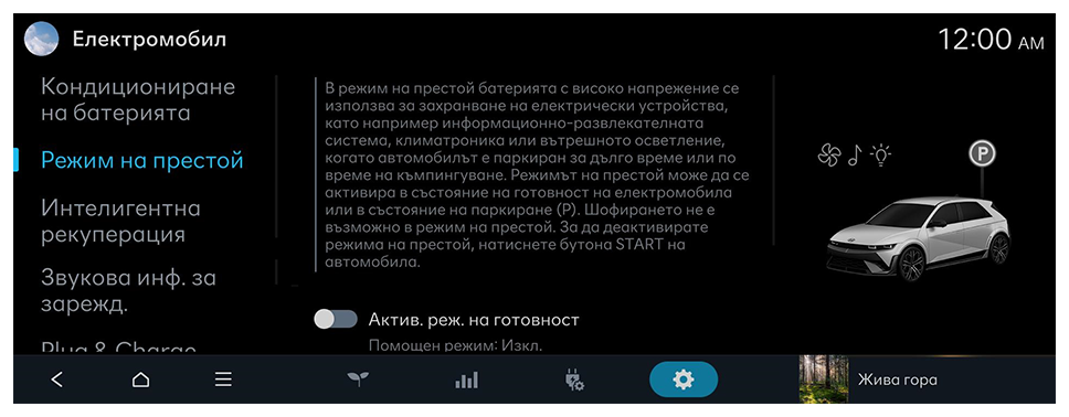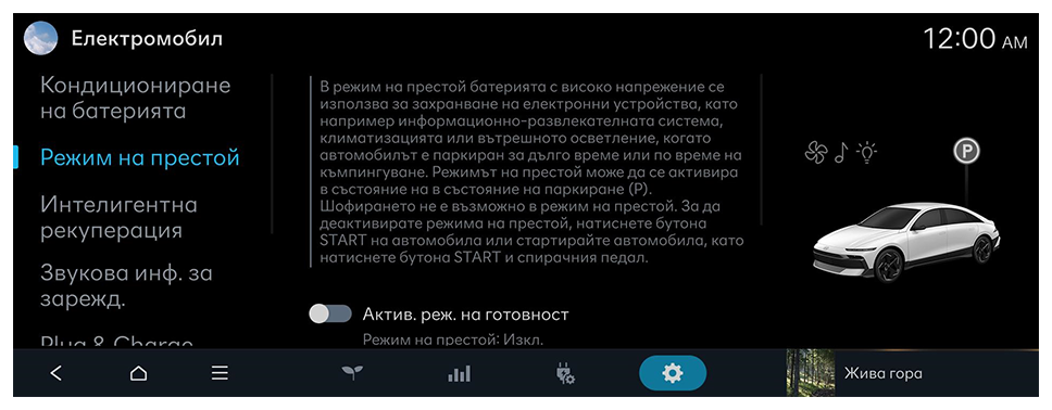 В режим на престой батерията с високо напрежение се използва за захранване на електрически устройства, като например информационно-развлекателната система, климатроника или вътрешното осветление, когато автомобилът е паркиран за дълго време или по време на къмпингуване.