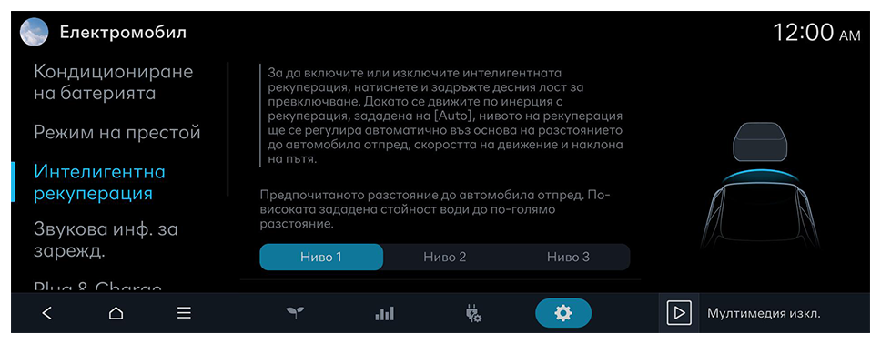 Автоматичното регулиране на интензивността на спиране при рекуперация е настроено на [Автоматично]. Това регулиране се извършва, докато автомоб. се движи по инерция, и се основава на установ. скорост на движение, разстоянието до водещия автомобил и наклона на пътя.