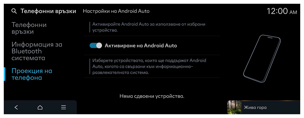 - На началния екран натиснете Настройки ► Телефонни връзки ► Проекция на телефона ► Настройки на Android Auto и след това активирайте Активиране на Android Auto.