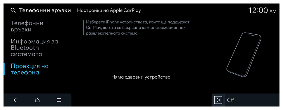 - На началния екран, натиснете Настройки ► Телефонни връзки ► Проекция на телефона ► Настройки на Apple CarPlay.