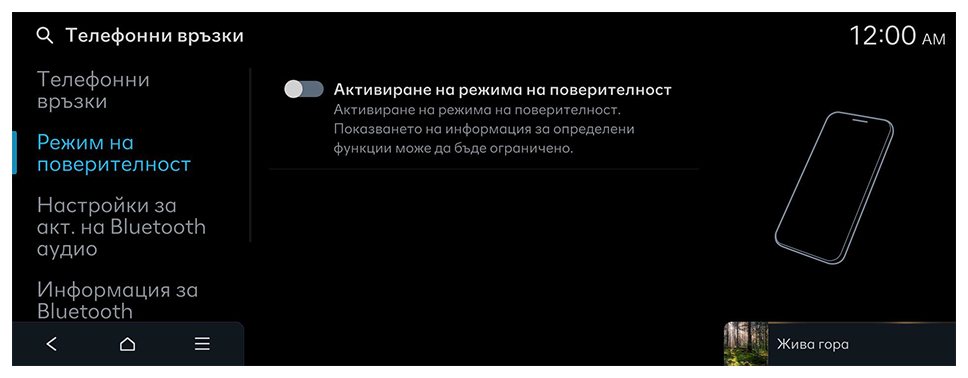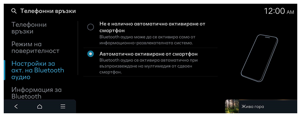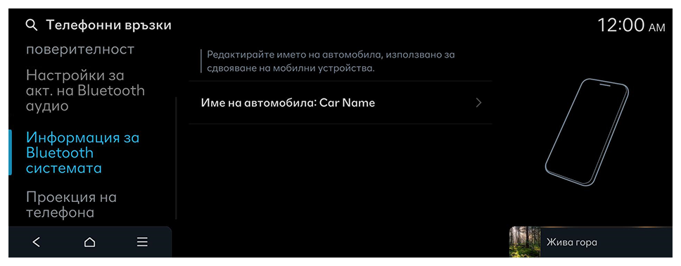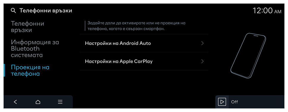 Управлявайте Bluetooth устройства или конфигурирайте техните работни настройки. Можете също да активирате проекцията на телефона, така че да можете да управлявате приложението на смартфона от екрана на системата след свързване на смартфона към системата.