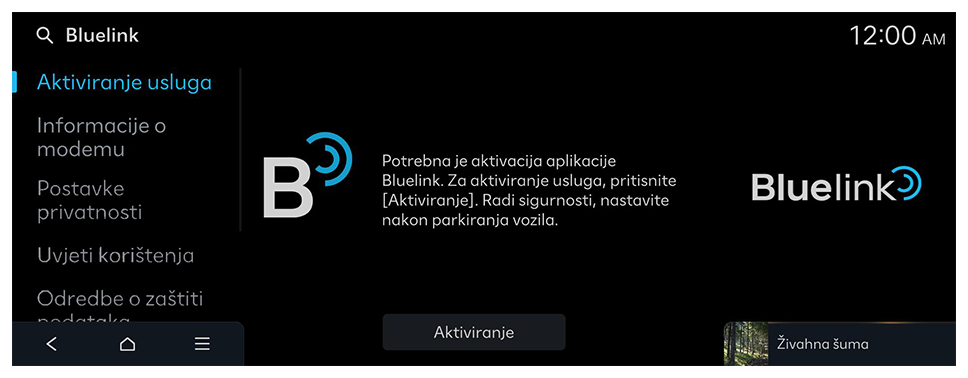 - Na početnom zaslonu pritisnite Postavke ► Bluelink ► Aktiviranje usluga.