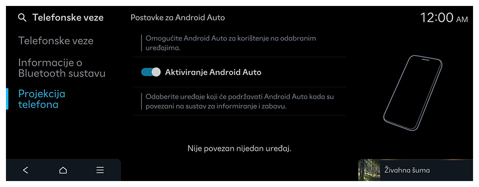 - Na početnom zaslonu dodirnite Postavke ► Telefonske veze ► Projekcija telefona ► Postavke za Android Auto, a zatim omogućite Aktiviranje Android Auto.