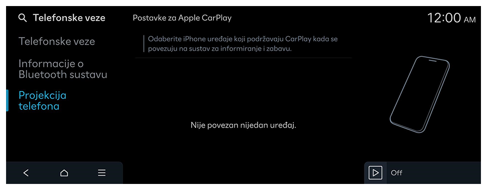- Na početnom zaslonu pritisnite Postavke ► Telefonske veze ► Projekcija telefona ► Postavke za Apple CarPlay.