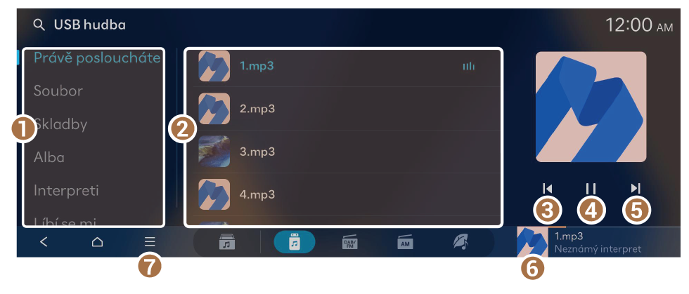 Na obrazovce přehrávače hudby z USB opakovaně stiskněte tlačítko .