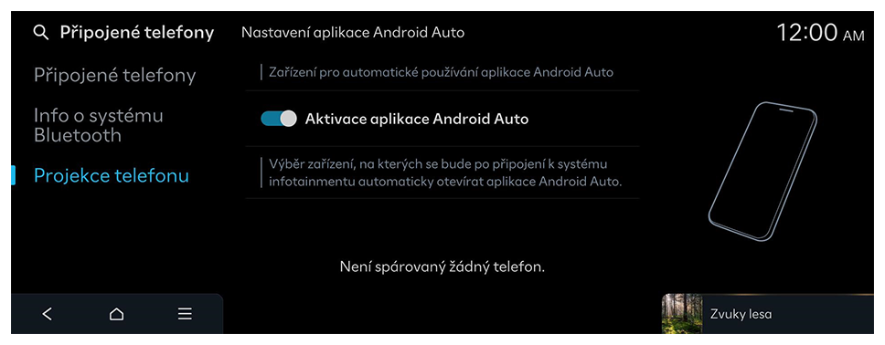 - Po úspěšném připojení chytrého telefonu se na domovské obrazovce přepne Projekce telefonu na možnost Android Auto. Pokud se možnost Android Auto nezobrazí, pokuste se připojení zopakovat.