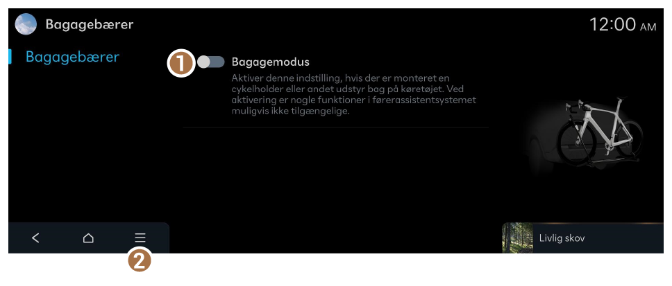 - Aktiver denne indstilling, hvis der er monteret en cykelholder eller andet udstyr bag på køretøjet. Ved aktivering er nogle funktioner i førerassistentsystemet muligvis ikke tilgængelige.