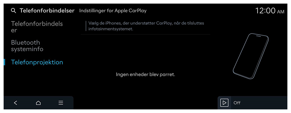 - På startskærmen skal du trykke på Indstillinger ► Telefonforbindelser ► Telefonprojektion ► Indstillinger for Apple CarPlay.