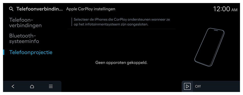 - Druk in het startscherm op Instellingen ► Telefoonverbindingen ► Telefoonprojectie ► Apple CarPlay instellingen.