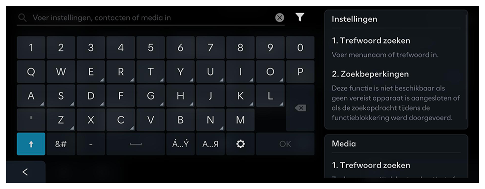 te drukken, als het pictogram op het scherm wordt weergegeven. - Zoekresultaten worden sequentieel weergegeven op basis van de structuur van het betrokken menu en de informatie in verschillende modi.