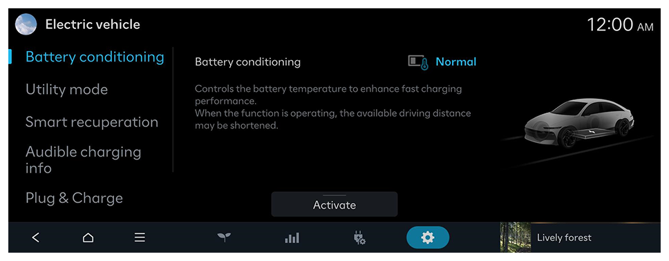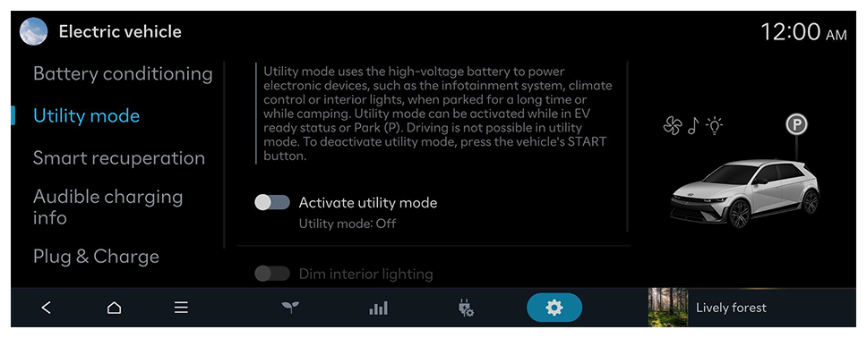 Utility mode uses the high-voltage battery to power electronic devices, such as the infotainment system, climate control or interior lights, when parked for a long time or while camping.