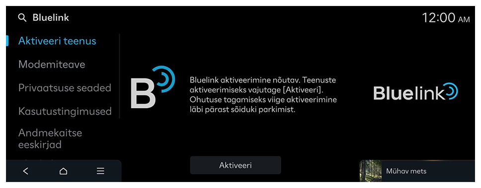- Vajutage avakuval Seaded ► Bluelink ► Aktiveeri teenus.