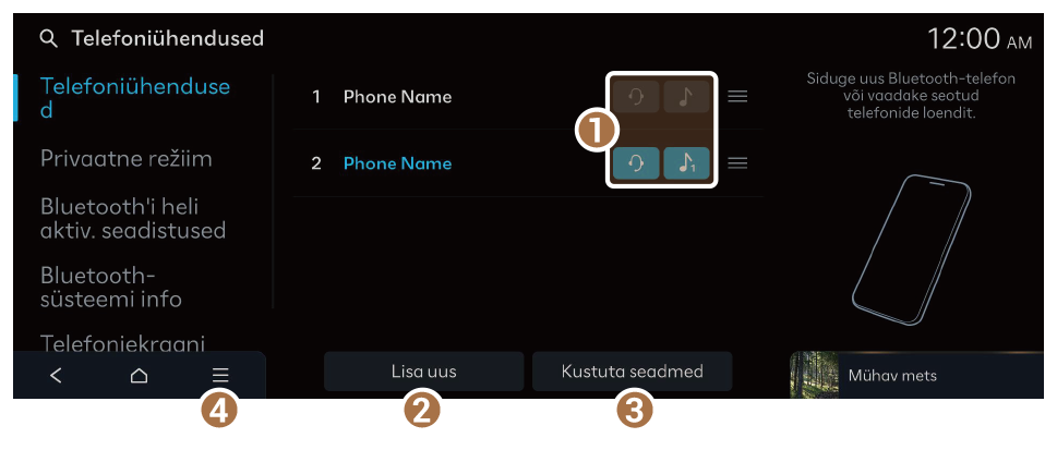 1. Vabakäekomplekti või Bluetoothi heli valimine Bluetoothi seadmete ühendamiseks või ühenduse katkestamiseks.