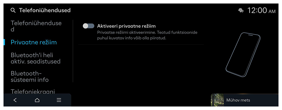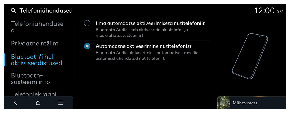 Te saate hallata Bluetoothi seadmeid või konfigureerida nende töösätteid. Samuti saate aktiveerida telefoniekraani peegeldamise, nii et pärast nutitelefoni ühendamist süsteemiga saate juhtida nutitelefoni rakendust süsteemi ekraanilt.