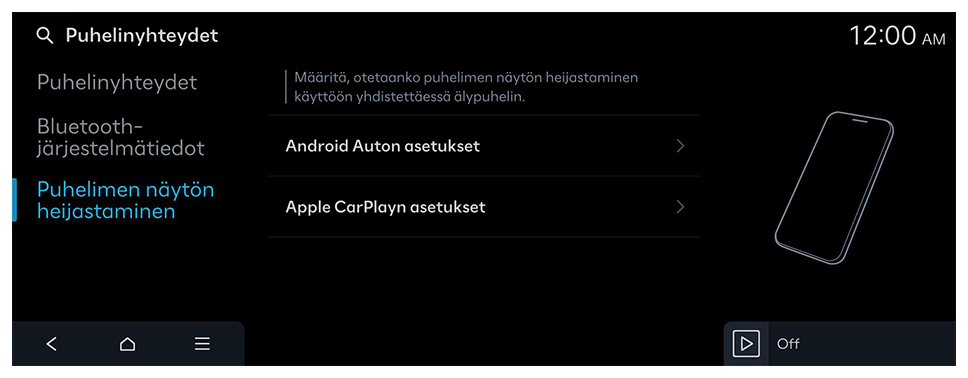 Android Auton tai Apple CarPlayn avulla voit käyttää ja ohjata sovelluksia Android-älypuhelimessa tai iPhonessa käyttämällä järjestelmän laajakuvamaista ja helppokäyttöistä käyttöliittymää.