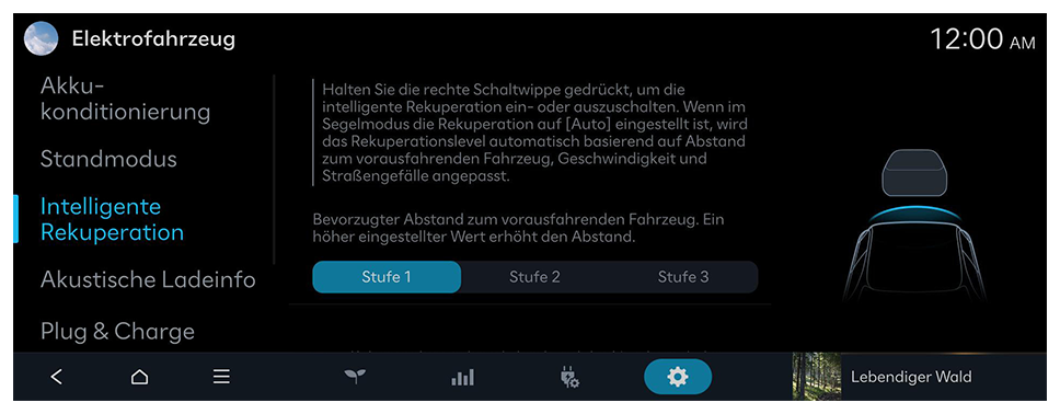 Automatische Anpassung der Bremsintensität, wenn die Rekuperation auf [Auto] eingestellt ist. Diese Anpassungen werden vorgenommen, während das Fahrzeug ausrollt, und basieren auf der erkannten Fahrgeschwindigkeit, dem Abstand zum vorausfahrenden Fahrzeug und der Straßenneigung.