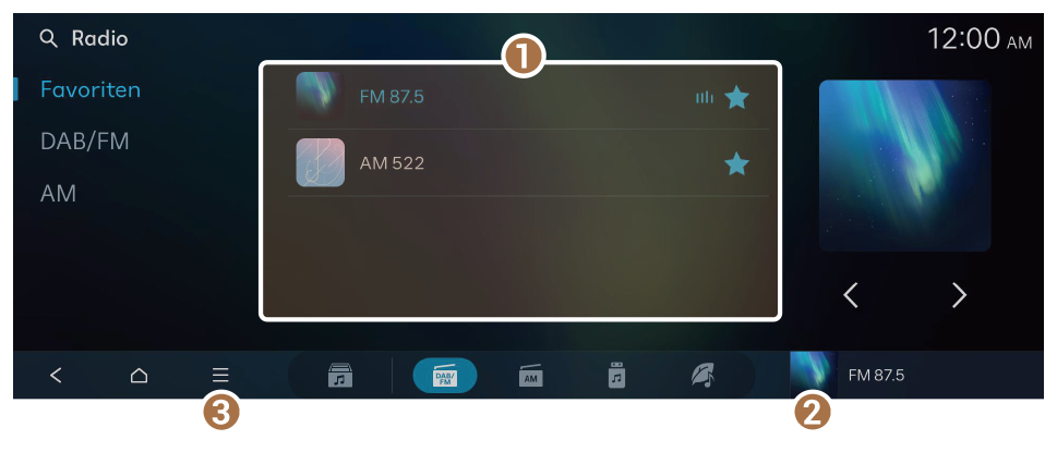 . - Sie können alle Sender, auf die über den DAB/FM-Bildschirm zugegriffen werden kann, in der Favoritenliste speichern. Drücken Sie auf dem DAB/FM-Bildschirm