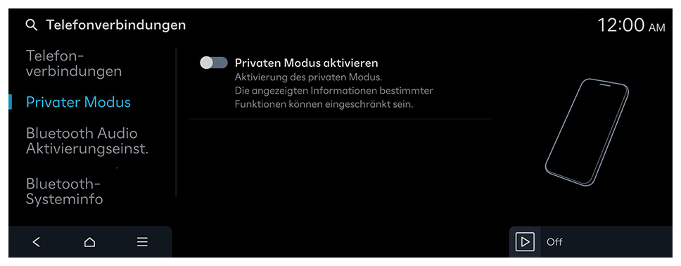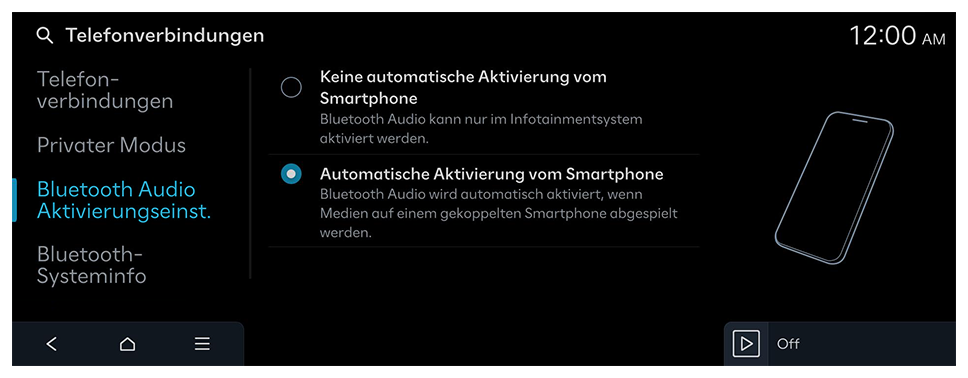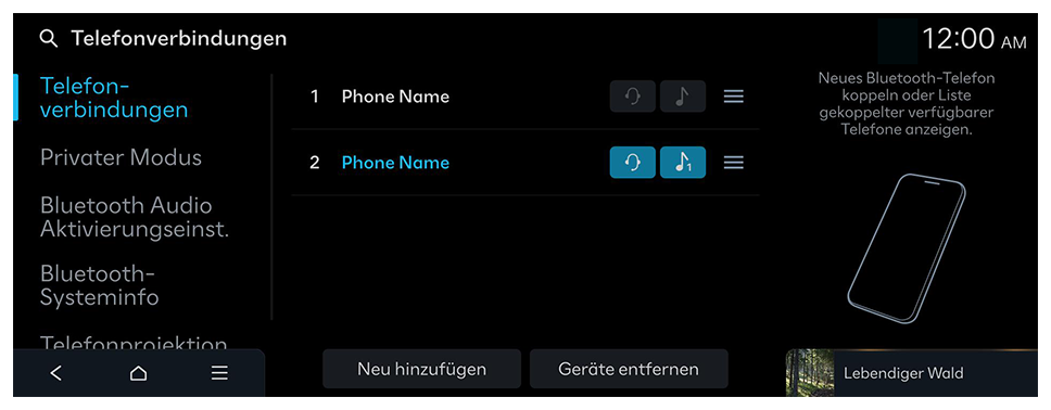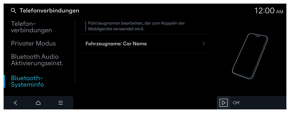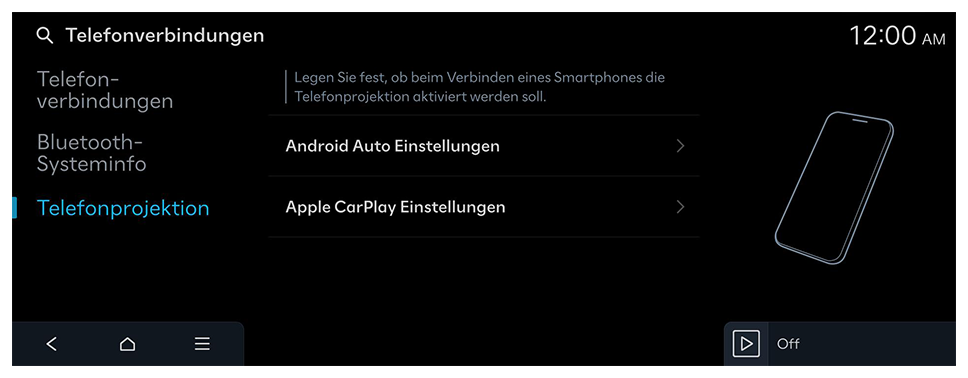 Verwalten Sie Bluetooth-Geräte oder konfigurieren Sie deren Betriebseinstellungen. Sie können auch die Telefonprojektion aktivieren, sodass Sie die Smartphone-App vom Systembildschirm aus steuern können, nachdem Sie das Smartphone mit dem System verbunden haben.