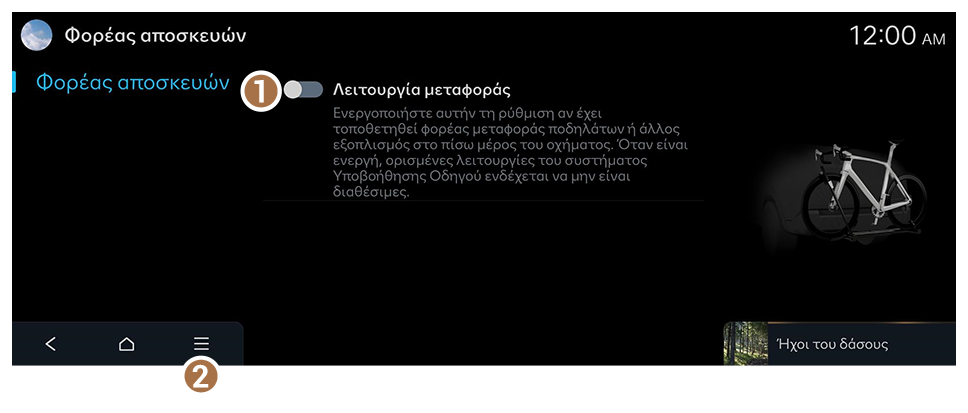 - Ενεργοποιήστε αυτήν τη ρύθμιση αν έχει τοποθετηθεί φορέας μεταφοράς ποδηλάτων ή άλλος εξοπλισμός στο πίσω μέρος του οχήματος. Όταν είναι ενεργή, ορισμένες λειτουργίες του συστήματος Υποβοήθησης Οδηγού ενδέχεται να μην είναι διαθέσιμες.