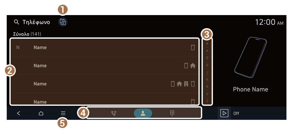 Γίνεται λήψη των επαφών που είναι αποθηκευμένες στο κινητό σας τηλέφωνο. Μπορείτε να πραγματοποιήσετε μια κλήση επιλέγοντας μια επαφή από την οθόνη του συστήματος.