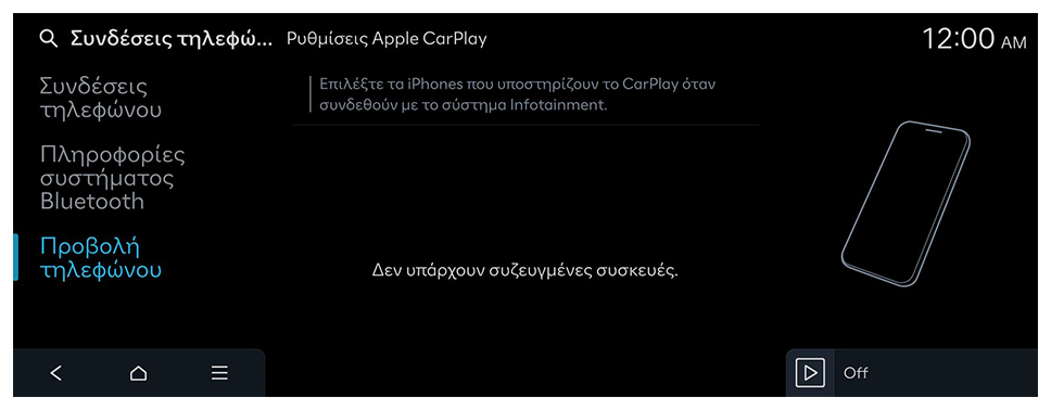 - Στην αρχική οθόνη, πατήστε Ρυθμίσεις ► Συνδέσεις τηλεφώνου ► Προβολή τηλεφώνου ► Ρυθμίσεις Apple CarPlay.