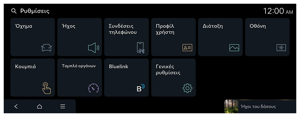 στην οθόνη ή πατήστε το κουμπί [SEARCH] στον πίνακα ελέγχου, εισαγάγετε έναν όρο αναζήτησης και έπειτα επιλέξτε το στοιχείο για εκτέλεση. - Οι διαθέσιμες ρυθμίσεις ενδέχεται να διαφέρουν ανάλογα με το μοντέλο και τις προδιαγραφές του οχήματος.