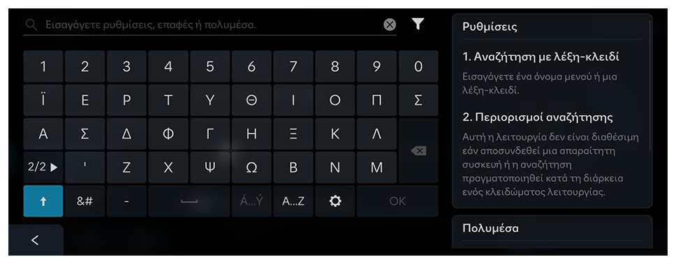 , αν το εικονίδιο εμφανίζεται στην οθόνη. - Τα αποτελέσματα αναζήτησης εμφανίζονται διαδοχικά βάσει της δομής του παρεχόμενου μενού και των πληροφοριών σε διάφορες λειτουργίες.