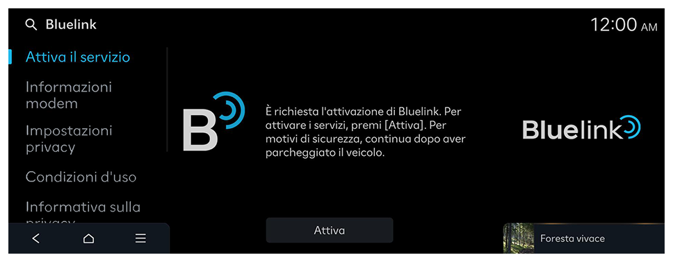 - Nella schermata Home, premere Impostazioni ► Bluelink ► Attiva il servizio.