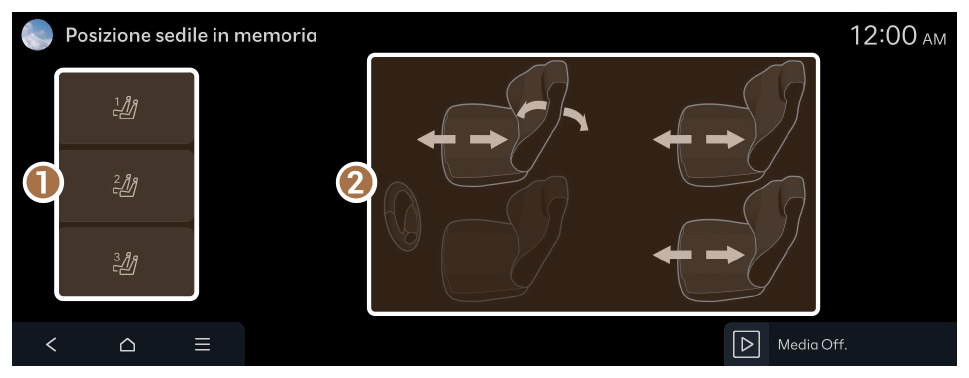 ► Impostazioni sedili. - Durante la guida, non è possibile regolare e salvare la posizione dei sedili, o caricare una posizione dei sedili salvata. Per prima cosa, arrestare il veicolo, quindi cambiare la posizione di un sedile.