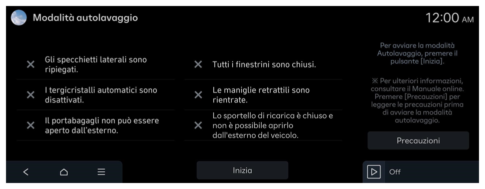 ]. Per esempio, se viene visualizzata l'icona dell'azionamento manuale per il tettuccio apribile, verificare il tettuccio e assicurarsi che non siano presenti oggetti estranei prima dell'inizio del lavaggio.