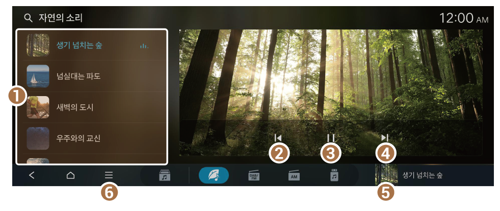 운전자의 긴장을 완화하고 편안하게 주행할 수 있도록 빗소리, 파도 소리 등 자연의 소리를 선택해 재생할 수 있습니다.