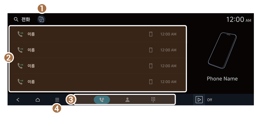 - 스티어링 휠의 이동 버튼을 사용하여 최근 통화 목록을 스크롤할 수 있습니다. 원하는 연락처를 눌러서 선택하세요.