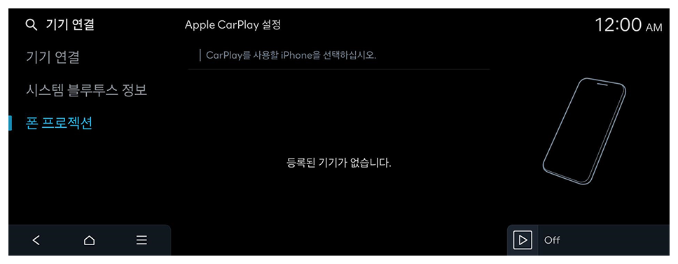 - iPhone이 정상적으로 연결되면 홈 화면에서 폰 프로젝션이 Apple CarPlay로 바뀝니다. Apple CarPlay가 표시되지 않을 경우 연결을 다시 시도하세요.