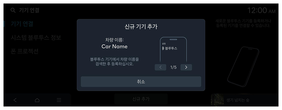 - 시스템의 블루투스 이름은 신규 기기 추가 팝업창에서 확인하세요.