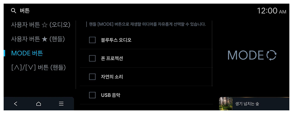 핸들 [MODE] 버튼으로 재생할 미디어를 자유롭게 선택할 수 있습니다.