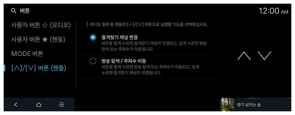 라디오 청취 중 핸들의 [∧]/[∨] 버튼으로 실행할 기능을 선택하십시오.