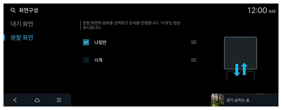 분할 화면의 종류를 선택하고 순서를 변경합니다. '시계'는 항상 표시됩니다.